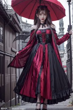 red dress,black dress,umbrella,vampire,wings,dress, gothic lolita, frills, lace, little red riding hood \(grimm\), lolita fashion, Halloween background, pumpkin