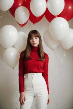 fashion portrait photo of beautiful young woman from the 60s wearing a red turtleneck standing in the middle of a ton of white balloons, taken on a hasselblad medium format camera