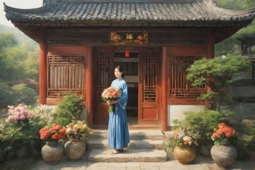 1 girl, house, chinaese style, holding flowers, nature, masterpiece, best quality, look at viewer, full body, realistic