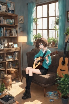 (masterpiece:1.2),(best quality:1.2),(Low saturation:1.2),(Light colors:1.2),(Isometric:1.1),good lighting,(A girl:1.5),aqua eyes,short hair,messy hair,expressionless,flat,shy,solo,Sitting position,(Lmao:1.5),Guitar,Bookcase,Hanging pictures,Windows,Curtains,Vintage wooden chair,Sundries,Potted Plants,Brown T-shirt,Black Short,Black Underwear,Long Boots,Knee high socks,Collar
