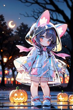 masterpiece,best quality,4k,1girl,raincoat,pop style,glowing,solo,looking at viewer,halloween,pumpkin,blush,long hair,bangs,brown hair,animal ears,brown eyes,standing,outdoors,shoes,blurry,tree,see-through,night,blurry background,animal hood,<lora:GlowingPP:0.7>,