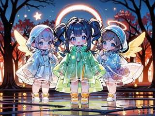 masterpiece,best quality,4k,3girls,multiple girls,raincoat,pop style,glowing,colorful,looking at viewer,angel,halo,halloween,pumpkin,blush,long hair,bangs,brown hair,outdoors,shoes,blurry,tree,see-through,flying,blurry background,<lora:GlowingPP:0.7>,