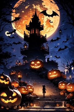 WANSHENG, jack-o'-lantern, halloween, tree, stairs, pumpkin, scenery, outdoors, night, from behind, standing, sky, solo, bare tree, silhouette, bat \(animal\), star \(sky\), glowing, moon, 1other, holding