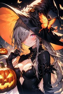WANSHENG, 1girl, hat, solo, gloves, breasts, long hair, black gloves, witch hat, looking at viewer, black headwear, dress, hair over one eye, jack-o'-lantern, black dress, bug, halloween, smile, cleavage, upper body, medium breasts, grey hair, butterfly, witch, closed mouth, hand up, pumpkin, pink eyes, blush, clothing cutout