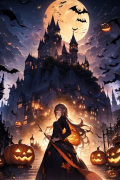 WANSHENG, 1girl, long hair, solo, halloween,standing in front of the castle, the castle