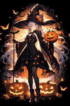 WANSHENG, 1girl, hat, solo, long hair, dress, witch hat, bug, butterfly, holding, black dress, looking at viewer, black footwear, jack-o'-lantern, very long hair, red eyes, flower, black headwear, witch, full body, hat flower, long sleeves, halloween, bangs, grey hair, frills, closed mouth, bow, breasts, gloves, high heels, orange flower, pumpkin, standing, black background, boots, pantyhose, black gloves, fire, wide sleeves, black pantyhose, long dress, staff, frilled dress