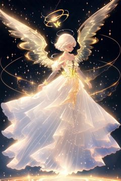 Best quality, 8k, cg,A girl formed by light,solo,glowing,light,A dress formed by light,starry_background,Angel wings formed by light,front,halo,bare_shoulders,hirschgeweih_antennas,magic,glowing_butterfly