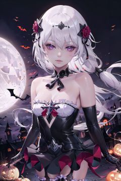 (8k, RAW photo, best quality, masterpiece:1.1), (realistic, photo-realistic:1.37), ultra-detailed, (high detailed skin:1.2), 8k uhd, dslr, soft lighting, high quality, film grain, Fujifilm XT3, professional lighting, photon mapping, radiosity, physically-based rendering photo of 1girl, cosplay, (loli:1.2), small chest, (spooky,gothic, Halloween:1.2 ), (eerie atmosphere), misty graveyard scene, jack-o’-lanterns, full moon night, bats silhouettes, crows, scary makeup, dramatic lighting, fantasy, (horror:0.9), ((seductive:1.2)), surrounded by magic symbols and ritual designs on the ground., <lora:chuyong-v100:0.8:lbw=OUTALL>, yuexia, theresa apocalypse, hair ornament, black gloves, white hair, hair flower, bangs, rose, bare shoulders, thigh boots, black footwear, black strapless dress, black thighhighs, <lora:EnvyBetterHands LoCon_beta2 辅助:0.55>, ( good hands, nice hands:0.5), (beautiful_face), ((intricate_detail)), (revealing clothes:1.2), clear face, ((finely_detailed)), fine_fabric_emphasis, ((glossy)),