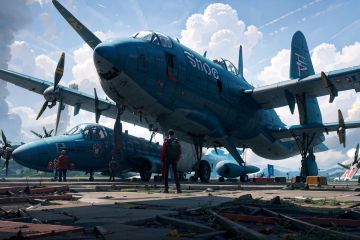 NYLostRuins, aircraft, outdoors, 1boy, scenery, standing, sky, cloud, military, airplane, water, vehicle focus, cloudy sky, solo, military vehicle, grey sky, male focus, science fiction, from behind, wide shot, short hair