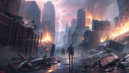 NYLostRuins,apocalyptic city full of war,fire,,incredible detailed game artwork,magic fog and lightning,