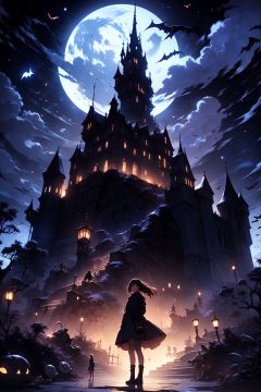 WANSHENG,  A girl standing in front of a castle, Night,Little ghosts