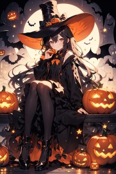 WANSHENG, 1girl, solo, long hair, hat, dress, bow, halloween, long sleeves, looking at viewer, bat \(animal\), pantyhose, wings, black dress, black headwear, holding, jack-o'-lantern, blush, black footwear, bangs, sitting, puffy sleeves, very long hair, mini hat, hair between eyes, brown eyes, closed mouth, food, red bow, black bow, full body, top hat, candy, star \(symbol\), black pantyhose