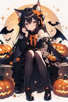 WANSHENG, 1girl, long hair, solo, orange bow, black hair, bow, pantyhose, wings, very long hair, orange eyes, long sleeves, dress, looking at viewer, black footwear, black pantyhose, black dress, sitting, bangs, frills, halloween, closed mouth, bat \(animal\), jack-o'-lantern, full body, shoes, frilled dress, orange bowtie, puffy sleeves, simple background, hand up, lolita fashion, blush, sparkle, white background, animal ears, pumpkin