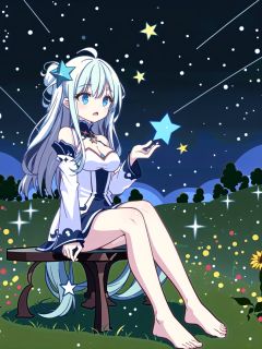 1girl,solo,sitting,long hair,breasts,star \(sky\),looking up,blue eyes,sky,starry sky,see-through sleeves,dress,bare shoulders,bangs,night,closed mouth,grass,white hair,see-through,outdoors,long sleeves,medium breasts,cleavage,shooting star,night sky,blush,hair between eyes,hair ornament,looking away,very long hair,thighs,flower,looking afar,feet out of frame,detached sleeves,collarbone,constellation,short dress,//,<lora:GenshinSimpleGraph-000160:0.95>,