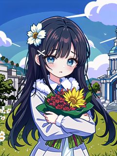 flower, 1girl, solo, crying, bouquet, tears, long hair, crying with eyes open, blush, parted lips, hair ornament, blue flower, white flower, bangs, black hair, cloud, fur trim, sky, cloudy sky, plaid, outdoors, looking at viewer, jacket, upper body, fur-trimmed jacket, holding, nose blush, holding bouquet, grey jacket, fur collar, hairclip, blue eyes, building, x hair ornament, looking to the side, unmoving pattern, day, plaid jacket//,<lora:GenshinSimpleGraph-000160:0.95>,