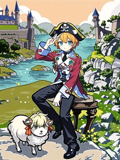 1boy,solo,Yellow eyes,monocle,Beige short hair,Sheep ear,Red Pirate Hat,Red pirate clothes,Sitting on the Earth,//,<lora:GenshinSimpleGraph-000160:0.95>,