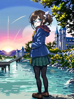 1girl,solo,plaid,pantyhose,skirt,outdoors,green eyes,hairclip,hair ornament,scarf,pleated skirt,hood down,fringe trim,blush,plaid scarf,long sleeves,hair ribbon,bangs,ribbon,black-framed eyewear,black pantyhose,brown hair,plaid skirt,hood,glasses,looking at viewer,day,sky,looking back,hair between eyes,brown skirt,blue ribbon,semi-rimless eyewear,under-rim eyewear,side ponytail,stairs,sidelocks,coat,standing,blue sky,closed mouth,red scarf,railing,sleeves past wrists,jacket,blue coat,feet out of frame,parted lips,blue jacket,open clothes,building,hand up,sunset,hooded coat,blurry,depth of field,hooded jacket,blurry background,open coat,//,<lora:GenshinSimpleGraph-000160:0.95>,
