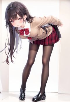 1girl, solo, pantyhose, skirt, long hair, loafers, shoes, simple background, school uniform, brown eyes, plaid, black pantyhose, plaid skirt, looking at viewer, black hair, pantyhose pull, full body, clothes pull, black footwear, pleated skirt, leaning forward, bangs, long sleeves, bent over, cardigan, bow, bowtie, standing, closed mouth, pulled by self, grey background, blush, miniskirt, red bow, sweater, **********
