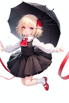 1girl, rumia, blonde hair, solo, white background, red eyes, red footwear, simple background, ascot, short hair, ribbon, open mouth, hair ribbon, smile, long sleeves, shirt, looking at viewer, red ascot, white socks, white shirt, red ribbon, shoes, socks, frills, bangs, outstretched arms, hair between eyes, skirt, :d, dress, vest, mary janes, black dress, black skirt, collared shirt, black vest, blush