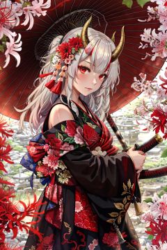 flower, horns, red flower, spider lily, virtual youtuber, 1girl, sword, red rose, nakiri ayame, katana, red eyes, camellia, oni horns, hair ornament, japanese clothes, umbrella, looking at viewer, solo, oil-paper umbrella, sheath, off shoulder, weapon, long hair, holding, kimono, oni, red hair