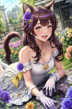 flower, pink flower, pink rose, rose, purple rose, hair flower, on stomach, purple flower, 1girl, hair ornament, dress, gloves, brown hair, long hair, yellow rose, yellow flower, smile, white rose, building, tail, bare shoulders, bangs, looking at viewer, solo, white flower, animal ears, open mouth