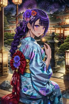 fireworks, braid, japanese clothes, kimono, hair ornament, 1girl, single braid, long hair, night, floral print, nail polish, aerial fireworks, looking at viewer, purple hair, flower, purple eyes, braided ponytail, hair flower, purple nails, night sky, east asian architecture, print kimono