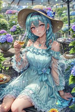 flower, 1girl, jewelry, hydrangea, dress, cup, hat, bracelet, drinking glass, umbrella, ribbon, looking at viewer