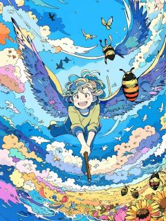 (best quality,masterpiece,fine detailed,),<lora:CJ cation:0.9>,ocean,sea surface,sky,blue sky,white clouds,sun,surround,top view,there was a girl in the sky,the  face to,bird,birds fly in the sky,bees,bees flying in the sky,1girl,insects,insects flying in the sky,eagles flying in the sky,, (best quality, high quality, masterpiece,),