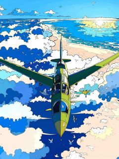 (best quality,masterpiece,fine detailed,),<lora:CJ cation:0.9>,ocean,sea surface,sky,blue sky,white clouds,sun,surround,aircraft,top view,there was a boy on the plane,the goy back to,the boy is flying the plane,propeller aircraft,, (best quality, high quality, masterpiece,),