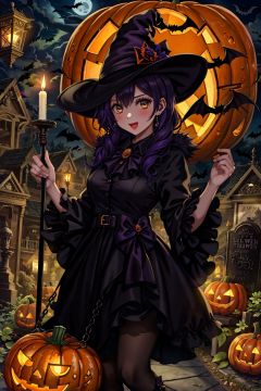 1girl, Lots of sweets, Witch., Halloween, jack-o'-lantern, bat, bat, Tombstone, Best quality, 8k