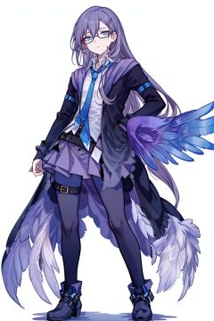 (masterpiece:1.3),(the best quality:1.2),(super fine illustrations:1.2),(Masterpiece),high quality,high detail,(white background:1.2),looking at viewer,(SOLO:1.4),outline,simplebackground,, feathered wings,wings,angel wings,bangs,thighhighs,high heels,boots,bird tail,bird wings,choker,white shirt,skirt,belt buckle,necktie,holding eyewear,open jacket,thigh holster,thigh strap,hair between eyes,jacket,blue eyes,belt,long hair,hairclip,