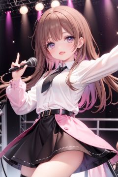 1girl, solo, microphone, smile, skirt, blush, brown eyes, long hair, open mouth, looking at viewer, brown hair, long sleeves, :d, shirt, bangs, belt, breasts, pink shirt, outstretched arm, music, black belt, medium breasts, holding microphone, singing