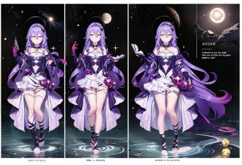 best quality, gradient, rainbow, (ultra-detailed:1.1), (multiple views:1.3), (picture book:1.2), (different scenes with Multi-screen:1.2), Block the picture, (Children's picture books, Illustration Book, multiple pictures), 4 pictures, character design, transparent border, template, text, character, [missionary | from behind | from side | from above], Figure Illustration, large size landscape painting, (text:1.2), expressions, note, Text description in the blank, [(simple background,white background:0.6),text,title :(Milky Way,Jupiter,Aldebaran behind the girl),bubble,fantastic,girl in star,full body,water surface,the water stretches as far as the eye can see:0.05], (different scenes with Multi-frames:1.2), <lora:xilin-v100:0.8:lbw=OUTALL>, xilin, long hair, purple hair, gloves, yellow eyes, purple gloves, hair ornament, bangs, dress, elbow gloves, barefoot, hair between eyes, little girl, cute, 13 years old, <lora:AGM-a1:0.3:lbw=paint>, <lora:Sketchy - Style:0.2>, <lora:多视角演示(charturnbetalora)CharTurnerBeta - Lora (EXPERIMENTAL):0.15:lbw=MIDD>, <lora:add_detail:0.35>, [[delicate fingers and hands:0.55]::0.85], (detail fingers), (empty hands:1.1), bare_hands, (beautiful_face), ((intricate_detail)), (revealing clothes:1.2), clear face, ((finely_detailed)), fine_fabric_emphasis, ((glossy)),