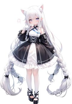 1girl, white_gloves, braid, full_body, gloves, long_hair, official_alternate_costume, pointy_ears, simple_background, solo, standing, very_long_hair, white_background, white hair, blue eyes, paw claw pose, open_mouth