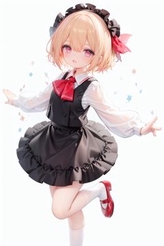 1girl, rumia, blonde hair, solo, white background, red eyes, red footwear, simple background, ascot, short hair, ribbon, open mouth, hair ribbon, smile, long sleeves, shirt, looking at viewer, red ascot, white socks, white shirt, red ribbon, shoes, socks, frills, bangs, outstretched arms, hair between eyes, skirt, :d, dress, vest, mary janes, black dress, black skirt, collared shirt, black vest, blush