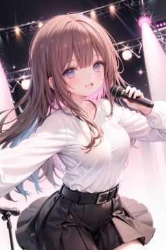1girl, solo, microphone, smile, skirt, blush, brown eyes, long hair, open mouth, looking at viewer, brown hair, long sleeves, :d, shirt, bangs, belt, breasts, pink shirt, outstretched arm, music, black belt, medium breasts, holding microphone, singing