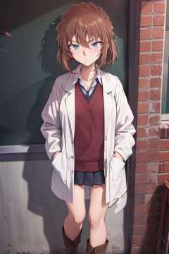 masterpiece,best quality,solo,1girl,boots,blue eyes, highres, looking at viewer,standing, labcoat, (school uniform:1.3), brown hair, hands in pockets,big eyes, <lora:haibara:0.8>