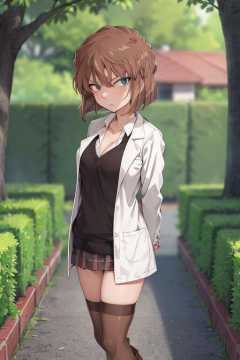 masterpiece,best quality,solo,haibara,1girl,boots,green eyes, highres, looking at viewer,cleavage,brown hair,outdoors,tree,(black legwear:1.3),school uniform,standing, arms behind back, serious, labcoat, <lora:haibara:0.8>