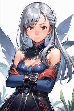 masterpiece, best quality, <lora:jingliu-mver-000008:1>, <lora:comiclo:1>,1girl, solo, red eyes, gloves, long hair, looking at viewer, dress, jewelry, bangs, earrings, black gloves, crossed arms, closed mouth, breasts, simple background, bare shoulders, white background, flower, grey background, hair between eyes, blue hair