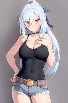 masterpiece, best quality, <lora:jingliu-mver-000008:1>,<lora:style04:1>,jingliu, 1girl, breasts, solo, long hair, shorts, shirt, white shorts, cleavage, black shirt, red eyes, white background, choker, bangs, closed mouth, hand on hip, looking at viewer, black choker, belt, simple background, large breasts, sideboob, grey hair, hair between eyes, fu hua, very long hair, sleeveless shirt, cowboy shot, hand on own chest, ponytail, hair ornament, short shorts, sleeveless, collarbone, jewelry, standing