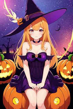 1girl,((lots of galaxy+halloween color feathers):1.3), orange tone color, cute face, sitting, Hair pumpkin, decorative art, pumpkin, xmv-hd, wsj-hd
