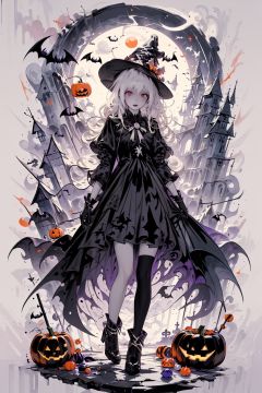 wansheng, flat color, 1girl, witch hat, hat, long hair, solo, jack-o'-lantern, halloween, moon, thighhighs, bat (animal), looking at viewer, dress, full body, gloves, pumpkin, witch, black thighhighs, star (symbol), bow,(pale skin:1.2),