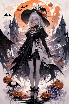 wansheng, flat color, 1girl, witch hat, hat, long hair, solo, jack-o'-lantern, halloween, moon, thighhighs, bat (animal), looking at viewer, dress, full body, gloves, pumpkin, witch, black thighhighs, star (symbol), bow,(pale skin:1.2),