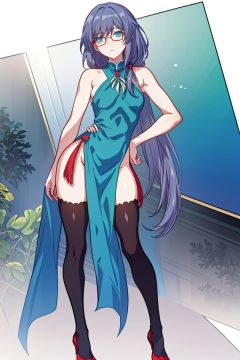 (masterpiece:1.3),(the best quality:1.2),(super fine illustrations:1.2),(Masterpiece),high quality,high detail,(white background:1.2),looking at viewer,(SOLO:1.4),outline,simplebackground,, blue eyes,chinese clothes,china dress,blue dress,fu hua,thighhighs,braid,red-framed eyewear,hair between eyes,grey hair,red footwear,black legwear,bare shoulders,sleeveless,very long hair,messy hair,