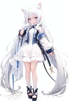 1girl, white_gloves, braid, full_body, gloves, long_hair, official_alternate_costume, pointy_ears, simple_background, solo, standing, very_long_hair, white_background, white hair, blue eyes, paw claw pose, open_mouth