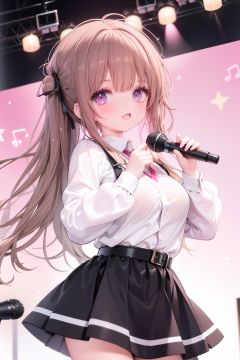1girl, solo, microphone, smile, skirt, blush, brown eyes, long hair, open mouth, looking at viewer, brown hair, long sleeves, :d, shirt, bangs, belt, breasts, pink shirt, outstretched arm, music, black belt, medium breasts, holding microphone, singing