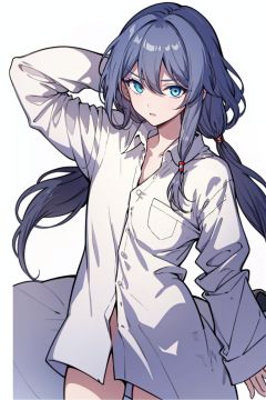 (masterpiece:1.3),(the best quality:1.2),(super fine illustrations:1.2),(Masterpiece),high quality,high detail,(white background:1.2),looking at viewer,(SOLO:1.4),outline,simplebackground,, blue eyes,fu hua,hair between eyes,barefoot,thighhighs,hair ornament,low-tied long hair,long sleeves,hair ribbon,grey hair,white shirt,long hair,bangs,1girl,