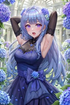 blue flower, flower, hydrangea, white flower, bracelet, 1girl, lily \(flower\), daisy, bell, blue rose, long hair, purple flower, solo, jewelry, breasts, dress, blue theme, arms up, open mouth, armpits, looking at viewer, medium breasts