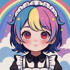 1girl, solo, maid headdress, plaid, cloud, (Rainbow hair: 1.2) Red eyes