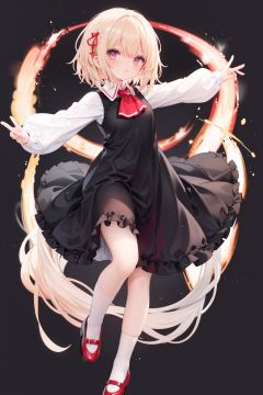 1girl, rumia, blonde hair, solo, white background, red eyes, red footwear, simple background, ascot, short hair, ribbon, open mouth, hair ribbon, smile, long sleeves, shirt, looking at viewer, red ascot, white socks, white shirt, red ribbon, shoes, socks, frills, bangs, outstretched arms, hair between eyes, skirt, :d, dress, vest, mary janes, black dress, black skirt, collared shirt, black vest, blush